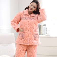 新款冬季珊瑚绒夹棉睡衣女士三层大码加厚法兰绒中老年家居服套装