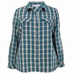 女士休闲衬衫,棉质花格衬衫,卷起袖子,配有拉链和胸袋