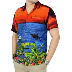日落按钮短袖阿罗哈夏威夷设计师男士口袋衬衫橙色