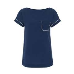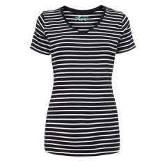 女士V领T恤,短袖,采用纱线染色条纹平针织面料,背面有徽标印花