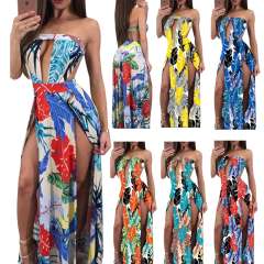 Women's Sexy Strapless Cut Out Backless High Slit Floral Print Maxi Dress