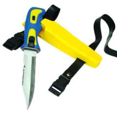 带防滑手柄的锋利水肺潜水刀。长度25.5厘米在护套。