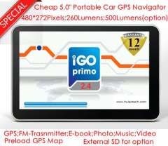 热销便携式手持5.0英寸车载GPS导航仪与Wince 6.0 Cortex A7双核800MHz CPU,蓝牙免提,FM发射机Sat Nav G-5003
