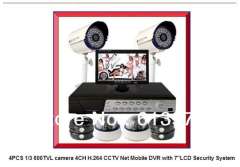 4颗1/3 600TVL摄像机4路H.264央视网移动硬盘录像机7'LCD安全监控系统