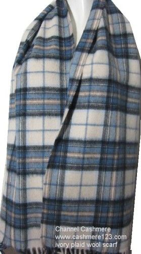 100% soft wool ivory blue plaid woven scarf