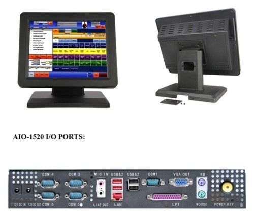 Features: Easy operation on the disc installment and dissembled management With advanced Fanless design, the main-board circuit works under a better environment without the dust damage With Wi-Fi function optional High stable Performance with reasonable cost With built-in cable connectors, the cables can be plug-in easily, with the good connection, which can eliminate accidental disconnection during the daily cleaning. Saving space and neat professional look. Specifications: LCD size: 15-inch TFT LCD Color Black Main board: Intel® Processor D525 D525 D525 CPU: Intel® Atom D525 CPU dual-core 1.8GB1.8GB1.8GB Chip set: Intel D525 + ICH8M chip set Memory supported: DDRIII 1, 066/1, 333 X 1, 2GB (up to 4GB maximum), 32GB SSD Brightness: 250CD/m²²sup2;² Resolution: 1, 024 X 768 pixels (maximum) Touch screen: 5 wire- resistive panel Viewing angle: Horizon: 140 degrees Vertical: 130 degrees I/O supporting Operating temperature: 0 to 40° Ceg; Ceg; C Storage temperature: -20 to 60° Ceg; Ceg; C Power input: DC adapter 12V X 5A, 110 to 240V/50 to 60Hz AC power input Power consumption: 35W (maximum) Compliance: FCC Class A/CE mark/LVD/CCC Operating system: Microsoft's Windows X Optional peripherals: ISO tracks 1/2/3 magnetic stripe reader and Wi-Fi and VFD customer display or 15-inch touch secondly screen (optional) I/O ports: 1 X power button Sony's PS2 mouse X 1 Sony's PS2 key board X 1 COM ports X 5 Parallel: 1 X dB25 parallel port VGA (15-pin D-SUB) X 1 LAN: RJ-45 X 1 USB2.0 X 4 Audio out X 1, 2 X internal speakers (optional) Mic in X 1 POWER: POS power button DC IN: POS 12V DC input PS2/M: Mouse PS2/KB: Keyboard LPT: 25dB parallel printer Application Hospitality: Hotels, restaurants, fast food shops, cafes, bread shop Retail: Commercial Street, boutiques, department stores, cosmetic stores, high-level barber shop Leisure and entertainment: Sauna, nightclubs, theme parks, casinos, lottery sales points. Business industry: Car parks, hotels, aviation, subway, station