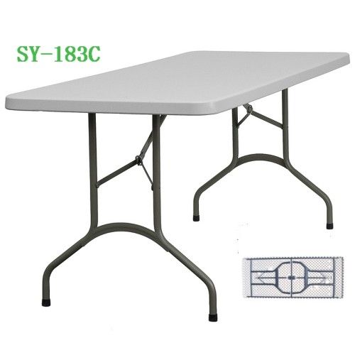 Features: 1. Durable Construction Quality 2. Easy to move and store 3. Made for Indoor &Outdoor User User Use 4. Gray Powder Coated Wishbone legs Full Specification: 1. Color: Granite white or as per customers' request 2. Unfolding size: 183*76*74cm 3. Folding size: 183*76*5cm 4. Material: HDPE & Powder coating Steel tube tube tube 5. Net weight: 16kgs Gross weight: 18kgs 6. Holding ability: 180kgs 7. Steel Tube size (diameter*thickness): 28*1.0mm 8. Board size (diameter*thickness): 50*1.0mm 9. Finish: Powder coating Feature: 1. Fashion design, green environmental and recycled material HDPE, very popular in home and abroad. 2. Durable construction quality. 45mm thick granite white blow molded polyethelyne plastic table top, Steel tube legs, 3. Lighteweight, easy to move and store. 4. Water proof, resist acid, alkali and high temperature. Very long service life for at least 5 years. 5. Can apply to many field for indoor, outdoor, commercial and entertainment use, such as home, office, restaurant, hotel, church, party, wedding and so on. Terms of Tnsaction 1. MOQ: 200 Sets 2. Lead Time: 20-25Days 3. Terms of Delivery: FOB Shanghai/ Ningbo; CIF 4. Terms of Payment: TT; L/C at Sight 5. Inspection: Full Inspection and Random Inspection 6. Packing: Each Set with One Poly Bag inside and One Carton Outside