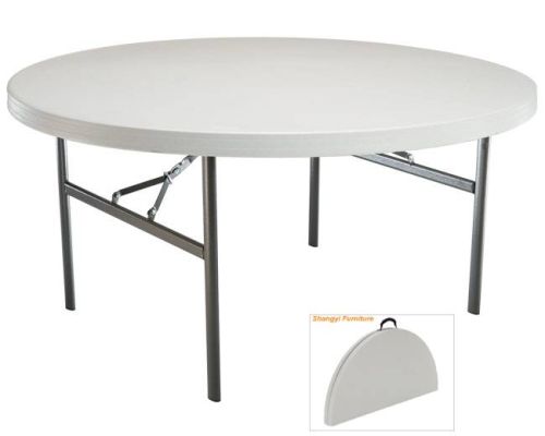 Product Specification 1. Item Name: 5 foot banquet round folding table 2. Item No: SY-152ZY 3. Color: Granite White 4. Material: Green environmental HDPE and Powder-coated steel tube 5. Unfolding Size: Dia150*74cm 6. Folding Size: L150*W75*H10cm 7. Steel Tube: 28*1.0mm 8. Net Weight: 20kg 9. Gross Weight: 22KG Weight Capacity: 180Kg at least Inner Package: 1 Piece/ Poly bag Outpackage: 1 Piece/ Carton Feature: 1. Fashion design, green environmental and recycled material HDPE, very popular in home and abroad. 2. Durable construction quality. 6.6 cm thick granite white blow molded polyethelyne plastic table top, Steel tube legs. 3. Lighteweight, easy to move and store. 4. Water proof, resist acid, alkali and high temperature. Very long service life for at least 5 years. 5. Can apply to many field for indoor, outdoor, commercial and entertainment use, such as home, office, restaurant, hotel, church, party, wedding and so on. Terms of Transaction MOQ: 200 PCS Lead Time: 15-20Days Terms of Delivery: FOB Shanghai/ Ningbo; CIF Terms of Payment: TT; L/C at Sight Inspection: Full Inspection and Random Inspection Packing: Each Set with One Poly Bag inside and One Carton Outside