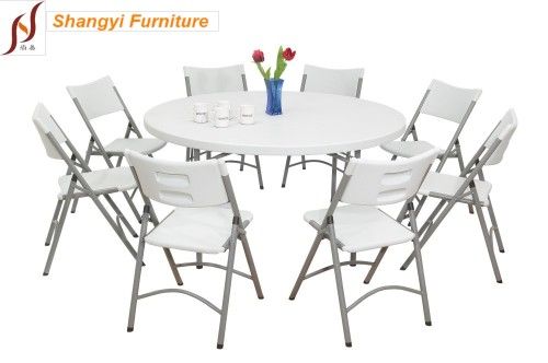1. Item Name: 5 foot banquet round folding table 2. Item No: SY-122Y 3. Color: Granite White 4. Material: Green environmental HDPE and Powder-coated steel tube 5. Unfolding Size: Dia122*74cm 6. Folding Size: L122*W122*H5cm 7. Steel Tube: 28*1.0mm 8. Net Weight: 11kg 9. Gross Weight: 13KG 10. Weight Capacity: 180Kg at least 11. Inner Package: 1 Piece/ Poly bag 12. Outpackage: 1 Piece/ Carton Feature: 1. Fashion design, green environmental and recycled material HDPE, very popular in home and abroad. 2. Durable construction quality. 6.6 cm thick granite white blow molded polyethelyne plastic table top, Steel tube legs. 3. Lighteweight, easy to move and store. 4. Water proof, resist acid, alkali and high temperature. Very long service life for at least 5 years. 5. Can apply to many field for indoor, outdoor, commercial and entertainment use, such as home, office, restaurant, hotel, church, party, wedding and so on. Terms of Transaction MOQ: 250 PCS Lead Time: 15-20Days Terms of Delivery: FOB Shanghai/ Ningbo; CIF Terms of Payment: TT; L/C at Sight Inspection: Full Inspection and Random Inspection Packing: Each Set with One Poly Bag inside and One Carton Outside