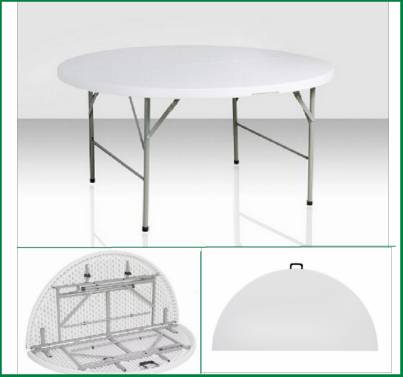 Product Specification 1. Item Name: 5 foot banquet round folding table 2. Item No: SY-152ZY 3. Color: Granite White 4. Material: Green environmental HDPE and Powder-coated steel tube 5. Unfolding Size: Dia150*74cm 6. Folding Size: L150*W75*H10cm 7. Steel Tube: 28*1.0mm 8. Net Weight: 20kg 9. Gross Weight: 22KG 10. Weight Capacity: 180Kg at least 11. Inner Package: 1 Piece/ Poly bag 12. Outpackage: 1 Piece/ Carton Feature: 1. Fashion design, green environmental and recycled material HDPE, very popular in home and abroad. 2. Durable construction quality. 6.6 cm thick granite white blow molded polyethelyne plastic table top, Steel tube legs. 3. Lighteweight, easy to move and store. 4. Water proof, resist acid, alkali and high temperature. Very long service life for at least 5 years. 5. Can apply to many field for indoor, outdoor, commercial and entertainment use, such as home, office, restaurant, hotel, church, party, wedding and so on. Terms of Transaction MOQ: 200 PCS Lead Time: 15-20Days Terms of Delivery: FOB Shanghai/ Ningbo; CIF Terms of Payment: TT; L/C at Sight Inspection: Full Inspection and Random Inspection Packing: Each Set with One Poly Bag inside and One Carton Outside