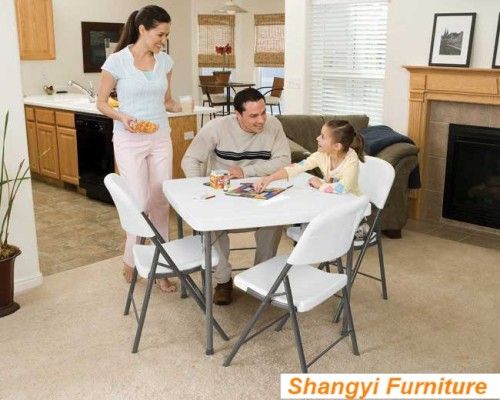 *Item Name: Square Folding Table *Item No: SY-87F *Color: Granite White *Material: Green environmental HDPE and Power-coated steel tube *Unfolding Size: L 87*W87*74cm(34''*34''*29'') *Folding Size: L 87*W87*5cm *Steel Tube: 28*1.0mm *Net Weight: 10Kg *Gross Weight: 11KG *Weight Capacity: 180Kg at least *Inner Package: 1 Piece/ Poly bag *Outpackage: 1 Piece/ Carton Feature: *Fashion design, green environmental and recycled material HDPE, very popular in home and abroad. *Durable construction quality. 6.6 cm thick granite white blow molded polyethelyne plastic table top, Steel tube legs, *Lighteweight, easy to move and store. *Water proof, resist acid, alkali and high temperature. Very long service life for at least 5 years. *Can apply to many field for indoor, outdoor, commercial and entertainment use, such as home, office, restaurant, hotel, church, party, wedding and so on. Terms of Transaction *MOQ: 200 pieces *Lead Time: 20-25Days *Terms of Delivery: FOB Shanghai/ Ningbo; CIF *Terms of Payment: TT; L/C at Sight *Inspection: Full Inspection and Random Inspection *Packing: Each Set with One Poly Bag inside and One Carton Outside