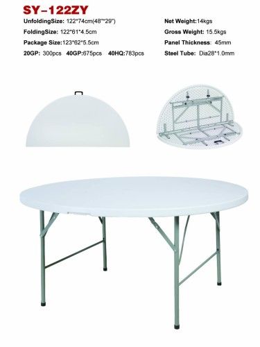 1. Item Name: 5 foot banquet round folding table 2. Item No: SY-122ZY 3. Color: Granite White 4. Material: Green environmental HDPE and Powder-coated steel tube 5. Unfolding Size: Dia122*74cm 6. Folding Size: L122*W61*H10cm 7. Steel Tube: 28*1.0mm 8. Net Weight: 11kg 9. Gross Weight: 13KG 10. Weight Capacity: 180Kg at least 11. Inner Package: 1 Piece/ Poly bag 12. Outpackage: 1 Piece/ Carton Feature: 1. Fashion design, green environmental and recycled material HDPE, very popular in home and abroad. 2. Durable construction quality. 6.6 cm thick granite white blow molded polyethelyne plastic table top, Steel tube legs. 3. Lighteweight, easy to move and store. 4. Water proof, resist acid, alkali and high temperature. Very long service life for at least 5 years. 5. Can apply to many field for indoor, outdoor, commercial and entertainment use, such as home, office, restaurant, hotel, church, party, wedding and so on. Terms of Transaction MOQ: 250 PCS Lead Time: 15-20Days Terms of Delivery: FOB Shanghai/ Ningbo; CIF Terms of Payment: TT; L/C at Sight Inspection: Full Inspection and Random Inspection Packing: Each Set with One Poly Bag inside and One Carton Outside