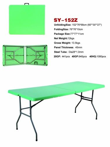 * Item No: SY-152Z * Color: Green * Material: Green environmental HDPE and Power-coated steel tube * Unfolding Size: L152*W76*H74CM(60''*30''*29'') * Folding Size: L152*W76*H10CM * Steel Tube: 25*1.0mm * Net Weight: 12Kg * Gross Weight: 13.5KG * Weight Capacity: 180Kg at least * Inner Package: 1 Piece/ Poly bag * Outpackage: 1 Piece/ Carton Feature: 1. Fashion design, green environmental and recycled material HDPE, very popular in home and abroad. 2. Durable construction quality. 6.6 cm thick granite white blow molded polyethelyne plastic table top, Steel tube legs, 3. Lighteweight, easy to move and store. 4. Water proof, resist acid, alkali and high temperature. Very long service life for at least 5 years. 5. Can apply to many field for indoor, outdoor, commercial and entertainment use, such as home, office, restaurant, hotel, church, party, wedding and so on. Terms of Tnsaction 1. MOQ: 200 Sets 2. Lead Time: 20-25Days 3. Terms of Delivery: FOB Shanghai/ Ningbo; CIF 4. Terms of Payment: TT; L/C at Sight 5. Inspection: Full Inspection and Random Inspection 6. Packing: Each Set with One Poly Bag inside and One Carton Outside