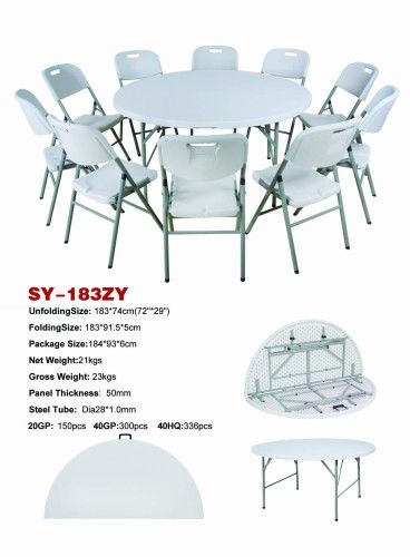 Product Specification 1. Item Name: 72''*30'' blow-molded plastic banquet round folding table 2. Item No: SY-183ZY 3. Color: Granite White 4. Material: Green environmental HDPE and Power-coated steel tube 5. Unfolding Size: Dia183*74cm(Dia72''*H30'') 6. Folding Size: L 183*W91.5*H10cm 7. Steel Tube: 28*1.0mm 8. Net Weight: 22kg Gross Weight: 24KG Weight Capacity: 180Kg at least Inner Package: 1 Piece/ Poly bag Outpackage: 1 Piece/ Carton Feature: 1. Fashion design, green environmental and recycled material HDPE, very popular in home and abroad. 2. Durable construction quality. 6.6 cm thick granite white blow molded polyethelyne plastic table top, Steel tube legs. 3. Lighteweight, easy to move and store. 4. Water proof, resist acid, alkali and high temperature. Very long service life for at least 5 years. 5. Can apply to many field for indoor, outdoor, commercial and entertainment use, such as home, office, restaurant, hotel, church, party, wedding and so on. Terms of Transaction MOQ: 150 Sets Lead Time: 15-20Days Terms of Delivery: FOB Shanghai/ Ningbo; CIF Terms of Payment: TT; L/C at Sight Inspection: Full Inspection and Random Inspection Packing: Each Set with One Poly Bag inside and One Carton Outside