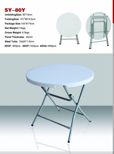 *Item Name: 2011 New Series SY-80Y Round Dining Table *Item No: SY-80Y *Color: Granite White *Material: Green environmental HDPE and Power-coated steel tube *Unfolding Size: Dia80cm*H74cm *Folding Size: L101*W80*H5cm *Steel Tube: 25*1.0mm *Net Weight: 7.5Kg *Gross Weight: 8.5KG *Weight Capacity: 180Kg at least *Inner Package: 1 Piece/ Poly bag *Outpackage: 1 Piece/ Carton Feature: *Fashion design, green environmental and recycled material HDPE, very popular in home and abroad. *Durable construction quality. 6.6 cm thick granite white blow molded polyethelyne plastic table top, Steel tube legs, *Lighteweight, easy to move and store. *Water proof, resist acid, alkali and high temperature. Very long service life for at least 5 years. *Can apply to many field for indoor, outdoor, commercial and entertainment use, such as home, office, restaurant, hotel, church, party, wedding and so on. Terms of Transaction *MOQ: 200 pieces *Lead Time: 20-25Days *Terms of Delivery: FOB Shanghai/ Ningbo; CIF *Terms of Payment: TT; L/C at Sight *Inspection: Full Inspection and Random Inspection *Packing: Each Set with One Poly Bag inside and One Carton Outside