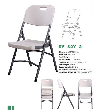 1. Item Name: SY-52Y-2 Blow-molded HDPE Plastic Folding Chair 2. Item No: SY-52Y-2 3. Color: Granite White 4. Material: Green environmental HDPE and Power-coated steel tube 5. Dimensions: 45*46*88cm 6. Steel Tube: 28*1.0mm 7. Net Weight: 19kg 8. Gross Weight: 21kg 9. Weight Capacity: 400Kg at least 10. Inner Package: 1 Piece/ Poly bag 11. Outpackage: 4 Pieces/ corrugated cardboard 12. Seating capacity: 1 persons 13. Maintenance: Easy to clean. Just use a mild soap and a soft-bristled brush. For tough stains, use a mild abrasive such as Soft Scrub. Use rubbing alcohol on wax, and a de-greaser for automotive grease. 14. Warranty: 2 Year limited factory warranty Δ Feature:Feature:eature: 1. Fashion design, green environmental and recycled material HDPE, very popular in home and abroad. 2. Durable construction quality. 5 cm thick granite white blow molded polyethelyne plastic table top, Steel tube legs. 3. Lighteweight, easy to move and store. Water proof, resist acid, alkali and high temperature. Very long service life for at least 5 years. 4. Can apply to many field for indoor, outdoor, commercial and entertainment use, such as home, office, restaurant, hotel, church, party, wedding and so on.