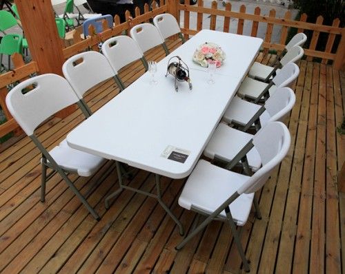 * Item No: SY-240Z * Color: Granite White * Material: Green environmental HDPE and Power-coated steel tube * Unfolding Size: L 240*W76*H74cm(94''*30''*29'') * Folding Size: L 120*W87*H10cm * Steel Tube: 28*1.0mm power coated * Net Weight: 20Kg * Gross Weight: 22KG * Weight Capacity: 180Kg at least * Inner Package: 1 Piece/ Poly bag * Outpackage: 1 Piece/ Carton Feature: *Fashion design, green environmental and recycled material HDPE, very popular in home and abroad. *Durable construction quality. 5cm thick granite white blow molded polyethelyne plastic table top, Steel tube legs, *Lighteweight, easy to move and store. *Water proof, resist acid, alkali and high temperature. Very long service life for at least 5 years. *Can apply to many field for indoor, outdoor, commercial and entertainment use, such as home, office, restaurant, hotel, church, party, wedding and so on. Terms of Transaction *MOQ: 500 Sets *Lead Time: 10-15Days *Terms of Delivery: FOB Shanghai/ Ningbo; CIF *Terms of Payment: TT; L/C at Sight *Inspection: Full Inspection and Random Inspection *Packing: Each Set with One Poly Bag inside and One Carton Outside Advantage *OEM Is Available *Great Production Ability: 500 Sets Each Day *Professional Design Team, Well Trained workers, Energetic Trader *Full Line Workshops with High-Tech Machines *Plenty Color Can be Chosed *Good service