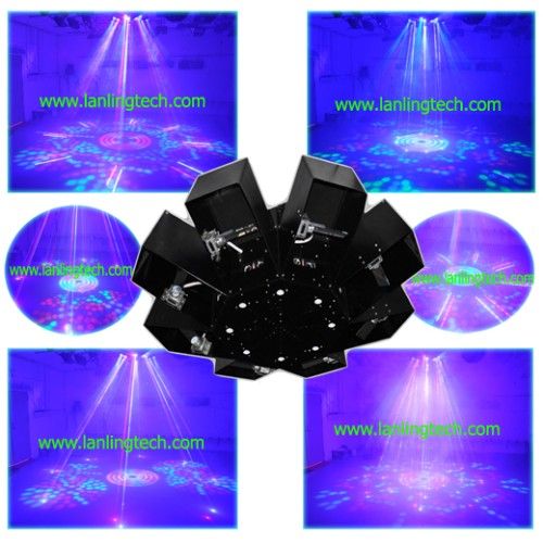 Multi Color Laser UFO Stage Light - LEN864RB Description: 8 Claw + 1 Center RGBYW LED lights 54W, and Fat-Beam Lasers Red: 8x200mW Blue: 8x300mW Feature: This huge light is an advanced combination of 16PCS RB laser net, 8 LED lights and 1 big rolling LED light in the middle, which its effects covers over 120° On the stage. Only this light is enough for your big stage. Laser net can display many effects such as laser curtain, laser color selection, flashing, rolling, flowing, speed, position selection. 8 big LED lights have functions of colors selection, speed, and position selection. LED lights can display in AUTO and Sound Active mode. It will turn off once there is no sound. The middle LED light is the greatest effect which has the function of speed control, spin direction and color selection. All of the laser lights and LED lights can be operated separately through DMX console.sole.sole. Scanning: Micro-step motor scanning at big angle Laser Red: 8PCS 200mW 650nm DPSS, fat beam Blue: 8PCS 300mW 450nm DPSS, fat beam Fat-beam laser diameter: 1cm to 1.2cm LED 9 LED lights: 612PCS LEDs, total 54 watts (each LED light: 16PCS red, 16PCS green, 16PCS blue, 16PCS yellow and 4PCS white LEDs) Play Mode: Sound Active, AUTO, DMX512 (10 channels), Master/Slave Interface: 3 pins XLR jack for DMX or Maser-Slave linking Power Supply: Bi-Voltage 110V to 220V-250V, 50/60Hz, 50W Net Weight 19Kg Inner Box: 985*985*361(0.35m³ )up3; )up3; ) Outer Box: 985*985*361(0.35m³ ), 1PCS/cartoncartoncarton Accessories Included: User's Manual Power Supply: Cable (UK, USA, EURO, AUS, BRZ, etc). Applicable Place: DJs, Bands, Bars, Pubs, Clubs, KTV, Family party, etc. Customized: OEM, ODM