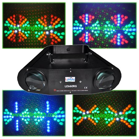 LED Laser Light stage lighting fixture - LE660RG Description: 8W LED 150mW Laser Light Feature Consisted by 136PCS supper bright (red, green, blue, yellow and white) LEDs, this light can create very beautiful LED full color effects. LEDs have functions of color changing, over 40 kinds of pattern changing, speed controlling, strobe, rolling, etc. Combining with colorful LED effects, this light displays red and green laser twinkling effects, e. G. Thousands of stars (dots) are shooting out from 2 small apertures. Scanning Micro-step motor scanning at big angle Laser Green: 50mW 532nm DPSS Red: 100mW 650nm DPSS LED 136PCS LEDs, total 8 watts Play Mode Sound Active, AUTO, DMX512 (14 channels), Master/Slave Interface 3 pins XLR jack for DMX or Maser-Slave linking Power Supply Bi-Voltage 110V to 220V-250V, 50/60Hz, 20W Inner Box 405*380*200(0.031m³ )sup3; )up3; ) Outer Box 785*420*450(0.148m³ ), 4PCS/cartoncartoncarton Accessories Included: User's Manual Power Supply Cable (UK, USA, EURO, AUS, BRZ, etc). Applicable Place DJs, Bands, Bars, Pubs, Clubs, KTV, Family party, etc. Customized OEM, ODM