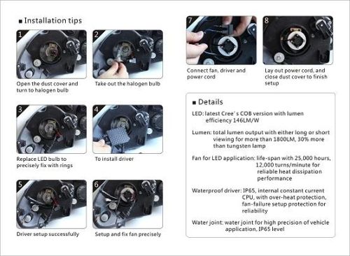 1.一套包括: 2 块 H7 LED CREE 灯、 2 件黑色防水驱动盒、 2 块优质风机指示灯和手册。