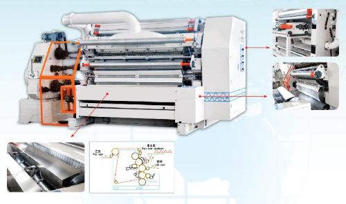 Fingerless vacuum suction type single facer, the upper and lower corrugated roller made of 48 CrMo alloy steel, with harted treatment, the hardness is above HRC58o-60°The surface is well treated by grind and plated chrome.