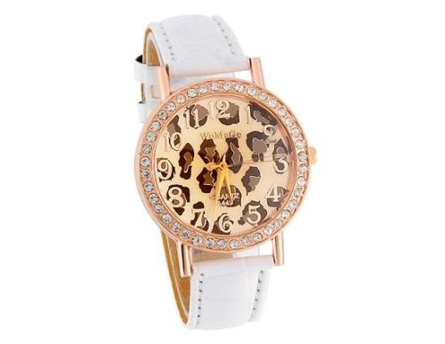 | Round dial quartz analog watch for women Leopard pattern on the dial and decorated with diamond Comfortable faux leather strap Suitable for any occasions | |