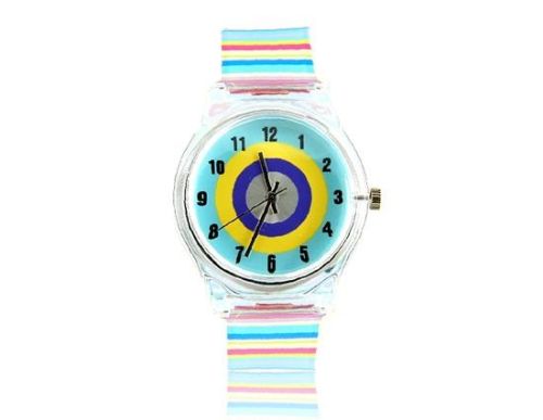Round shaped watch dial, plastic cement watch shell and colorful rainbow watchband.