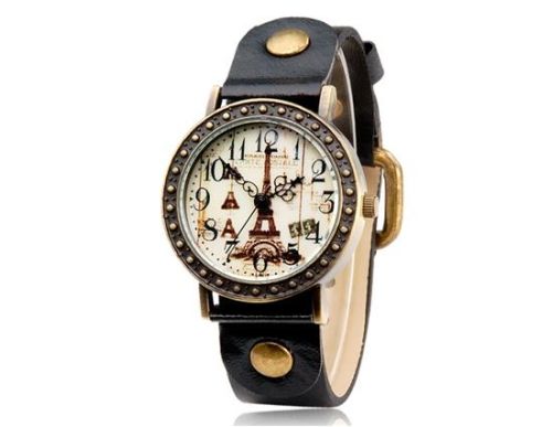 妇女的复古埃菲尔铁塔打印的圆形表盘模拟手表(黑色) M.
