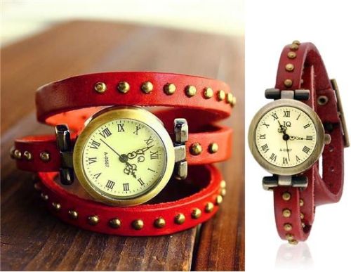 铆钉装饰三环路牛皮手链模拟手表(红色) M.