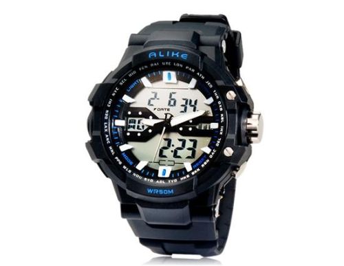 | Features a piece of AL35 movement for accuracy Comfortable TPU rubber strap 50 m waterproof Analog and digital display Supports month, week, date, alarm clock, snooze and stop watch functions Can see time clearly in the dark with the backlight Makes a great gift for yourself or your friends | |