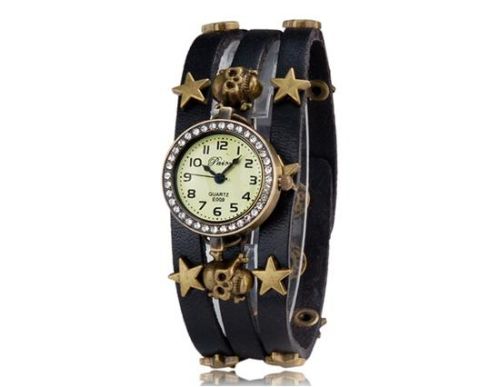 | Features a round dial decorated with crystals, analog display, electronic movement and three-strand leather strap with star & skull decoration Designed for women to wear Comfortable to wear | |