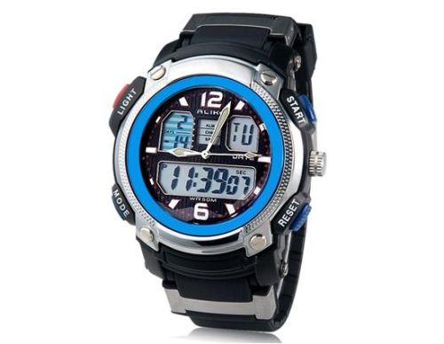 AK1163 圆拨号模拟与数字防水潜水手表 AL35 运动、 塑料外壳、 TPU 橡胶表带背光 (蓝色) M。