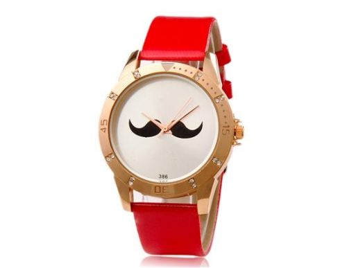 女子胡子图案的圆形表盘模拟手表与仿皮带(红色) M.