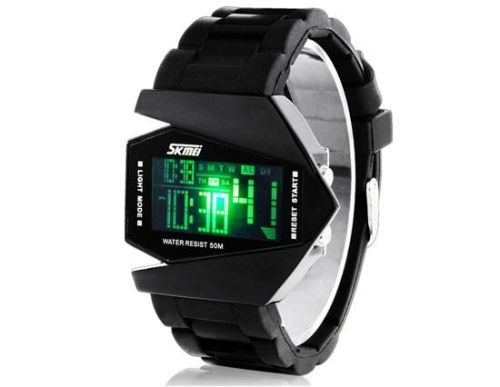 | 这种防水数码飞机形运动手表功能酷七彩LED灯 软表带正是适合您的手腕,是舒适佩戴 5ATM防水,防震 按左上角的按钮,点亮LED灯,你可以按下按钮三秒钟自动切换光色 左下角的按钮为功能切换按钮,可以切换到时间显示,秒表,闹钟设置和时间设置 要调整时间,按左下角的按钮,切换到时间设置界面,你会看到一个闪烁的第二个设置,按右下角的按钮,切换到分的设定; 调整小时,按右下角按钮,切换到小时设置。 按下右上角的按钮,添加一个数字 按下右下按钮切换到日,月,设置的一周 | |