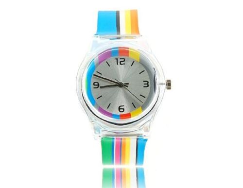 Round shaped watch dial, plastic cement watch shell and colorful rainbow watchband.