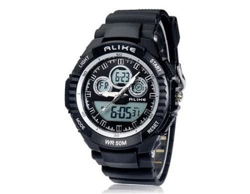 | Features a piece of AL35 movement for accuracy Comfortable TPU rubber strap 50 m waterproof Analog and digital display Supports month, week, date, alarm clock, snooze and stop watch functions Can see time clearly in the dark with the backlight Makes a great gift for yourself or your friends | |