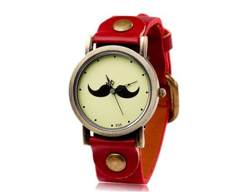 女子胡子图案的圆形表盘模拟手表与仿皮带(红色) M.