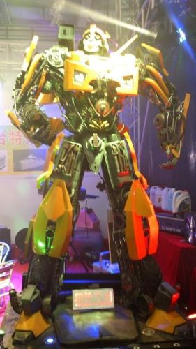 产品型号: WS-PY001 名称: 大黄蜂' 尺寸: 约2.5/3米 重量: 约500公斤 材料: 废旧环保钢铁材料 (支持来样定做, 多种款式可选) 此款机器人具有智能控制系统, 电脑编程功能, 多种动作, 可编辑各国语言, 可外加各种舞台特效灯光. 比如: 烟雾, 火柱, 雪花, 泡泡, 激光等功能. 特点: 取材独特 个性强烈 资源环保 低碳生活 激发创作热情 产业革新 (租赁或购买) 推荐活动类型参考方案: 楼盘开售活动 房地产宣传 大型开业庆典活动人气展览钢雕艺术群雕 商场活动策划 主题公园专题 大型空间展示. 目前一般使用在大型广场中心, 酒吧等. 本机器也可以租赁使用. 可根据客户定做外形和特效系统.