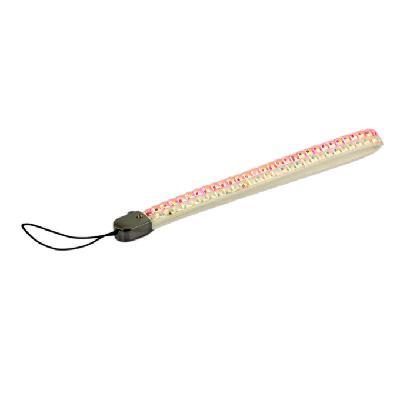 A thin string loops at the end allowing the strap to be attached to a cell phone, camera or other electronic device.