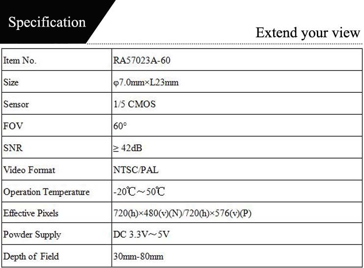1,本相机模块O / D是7.0毫米,它立足于1/5 “彩色CMOS ,提供彩色全面和清晰的图像。