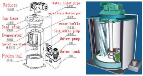 Flake ice production requiresless mechanical and human labors than block ice, and flake ice production does not require a defrost cycle.