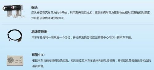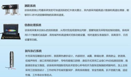 安全是汽车必备的要素之一, 没有安全一切都是空谈, 所以汽车主动安全用品不能被忽视, 目前河南超越公司生产和研发了一套汽车安全自动防撞产品, 它能有效及时的保护车主的人身安全, 它能在碰撞前一刻通过轮径传感器的速率测算到下一秒将要发生的碰撞时间, 来提醒车主减速并采取相应的措施逃避交通事故. 它是由激光雷达探测系统, 信息处理预警系统, 刹车系统三个器件组成, 能避免交通事故的发生.
