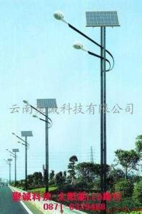 系统由太阳能电池组件部分 (包括支架) ,LED灯头, 控制箱 (内有控制器, 蓄电池) 和灯杆几部分构成; 云南聚诚太阳能电池板光效达到127Wp/ m2, 效率较高, 对系统的抗风设计非常有利; 灯头部分以1W-5W白光LED和1W-5W黄光LED集成于印刷电路板上排列为一定间距的点阵作为平面发光源.