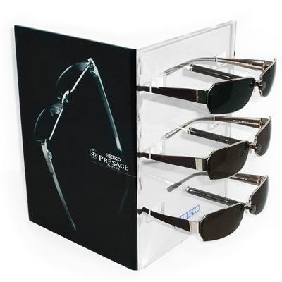一面展示宣传画, 另外一面展示眼镜, 金属镀光枪色柱子