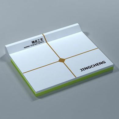 A-559, 这款烤漆眼镜展示平板, 主色是雪山白, 搭配了黄绿色边条, 面板镶嵌了金色金属十字纹, 工艺十分精湛, 是一款相当高档的展示道具