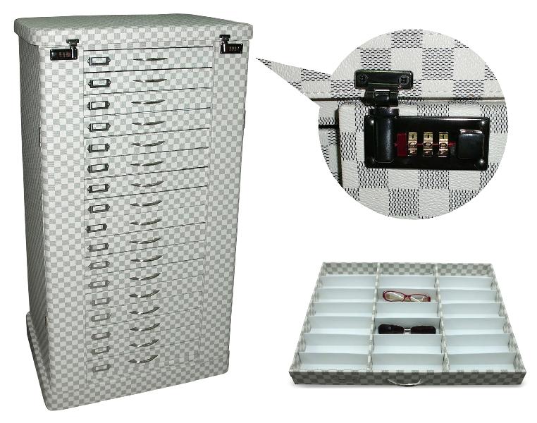 我公司眼镜柜箱子展示盒之优势: 出口标准工艺, 环保材料, 内盒裱特种布紧附, 不变形, 防污防静电防汗易擦除
