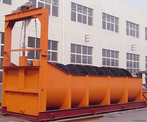 Spiral classifier (screw classifier) is widely used for distributing ore in the close circuit with ball mill, grading ore and fine slit in the gravity mill, grading granularity in the flow of metal ore-dressing and declaiming and dehydrating in the washing. Advantages are simple structure, reliable working condition and convenient operation. According to the principle that different grains are with different specific gravity and sedimentation rate in the liquid, the fine ore flows in the water and the coarse ore sinks in the bottom. The classifier that has machine grading by discharging from the top can filtrate the materials and send course materials to the feeding mouth and discharge the fine material from the pipe. The seat of the machine adopts channel steel and body adopts armor plate and the spiral axle adopts cast iron, so it's durable. The lifting equipment has two types, namely electricity and hand.