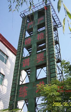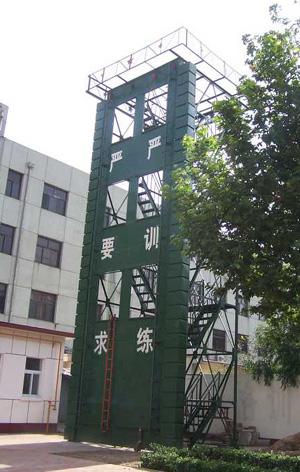 五, 在训练塔宜设置室外消防梯, 消防梯应通至塔顶, 并宜离地面3米高处设起, 宽度不宜小于50厘米. 消防训练塔产品说明: 多功能消防训练塔, 主要由 (1) 模拟窗 (2) 楼层隔板 (3) 后骨架 (4) 了望, 指挥平台骨架及主体钢结构框架等组成. 在塔体前端部位设有八个模拟窗 (根据需要定做几层窗口) ,在上, 下相邻的模拟窗之间设有楼层隔板 (钢板) .2, 在塔体后部下方设有与模拟窗相对应的后骨架. 3, 模拟窗与楼层隔板以及后骨架及主体框架相互之间用螺栓连为一体. 4, 层与层之间均有安全楼梯连接. 5, 塔体上部装有了望, 指挥平台. 6, 根据需要可安装测风仪, 凉水带架和警报器等. 7, 根据需要, 在消防训练塔旁边可制作模拟消防训练井. 8, 消防训练塔设备同时还配备消防专用滑轮, 滑竿, 模拟墙等附属设施. 本训练塔结构科学, 操作安全, 使用方便, 产品防腐处理热镀锌或热喷涂处理, 50年无需维护, 安全可靠. 具有消防训练, 了望, 测风, 报警等多种功能. 同时便于指挥长随时掌握消防官兵的动作要领. 是目前武警消防官兵消防训练实战演习之必备设备. 同时替代了过去砖混结构消防楼的历史.