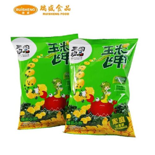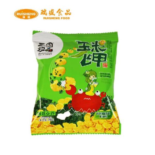 玉米片采用优质玉米, 经烘焙工艺加工而成. 不含任何人工色素, 不含防腐剂, 非油炸保持原粮香味及营养成分. 低脂肪低热量, 口感更脆更香. 富含烟酸和镁, 烟酸维系神经系统, 镁有助调节情绪, 缓解压力. 高纤维低脂肪, 是真正健康的减肥休闲食品. (绿色-海苔味)