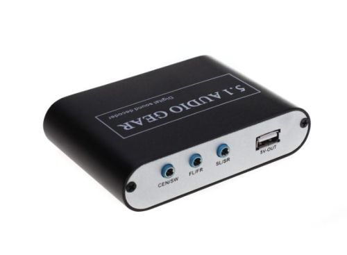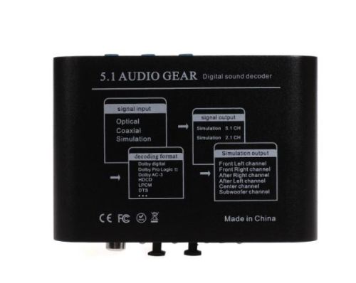 • Input: 2 x SPDIF Optical Input, 1 x Coaxial input, 1 x Stereo Audio • Output: 1 x CEN/ SW, 1 x FL/ FR, 1 x SL/ SR, 1 x USB-5V OUT. • Transfer the DTS/ AC-3 digital signal into 5.1 analog output (FL/ FR if 2.1) . • Transfer the stereo (R/ L) audio signal data into 5.1 analog output. • Two SPDIF input, one coaxial input, one sterero input supplying perfect solution for your HDTV player, XBOX360 etc. • One button to switch mode, simple to operate. • Auto detect AC3,DTS,PCM digital audio signal. • Decode format: Dolby Digital EX,DTS-ES,Dolby Pro Logic II,DTS,AC3, Dolby Digital. • S/ N: 120db • stereo separate degree: 80db (1KHZ) • Noise output frequency: 200uV • Simulate output frequency: 2.2V • Working temperature: -40~80℃ • Working Huminity: 5~90%RH • Demension: 105*75*25mm